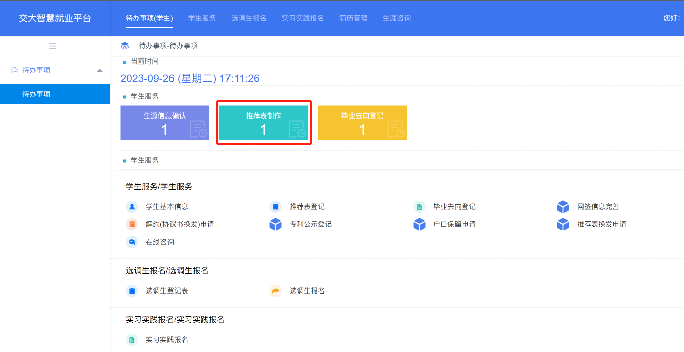 制作流程:在校就业网http://www.job.sjtu.edu.cn首页,jAccount登录,点击【推荐表制作】,进入毕业生推荐表编辑页面。【需要提前完善学生基本信息】