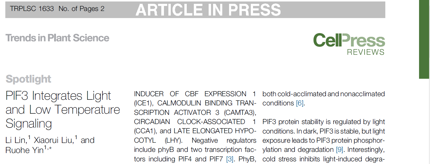 近日,taptap下载ios游戏植物光控发育团队在Cell Press旗下的专业综述杂志Trends in Plant Science在线发表了一篇题为“PIF3 Integrates Light and Low Temperature Signaling”的热点推荐文章(Spotlight)。