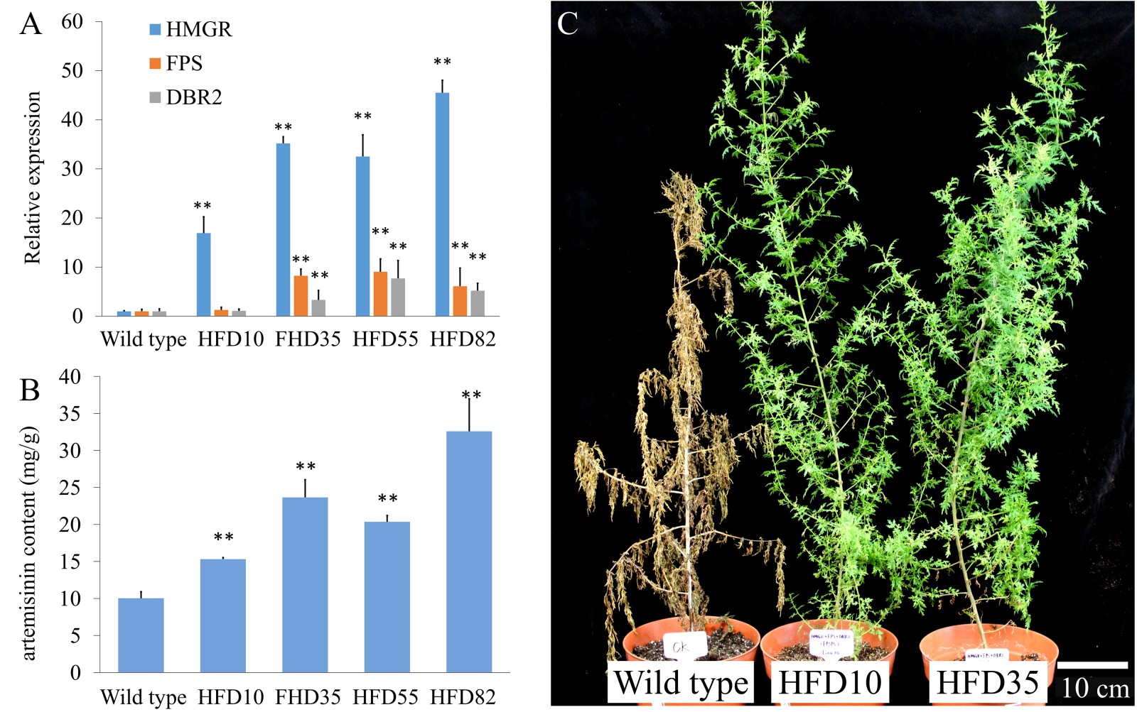 研究团队建立了能够高效促进青蒿素合成途径整个代谢流的上、中、下游多基因转化策略,成功培育出了高产青蒿素的代谢工程改良青蒿品种,其青蒿素的含量达到了叶片干重的3.2%左右。