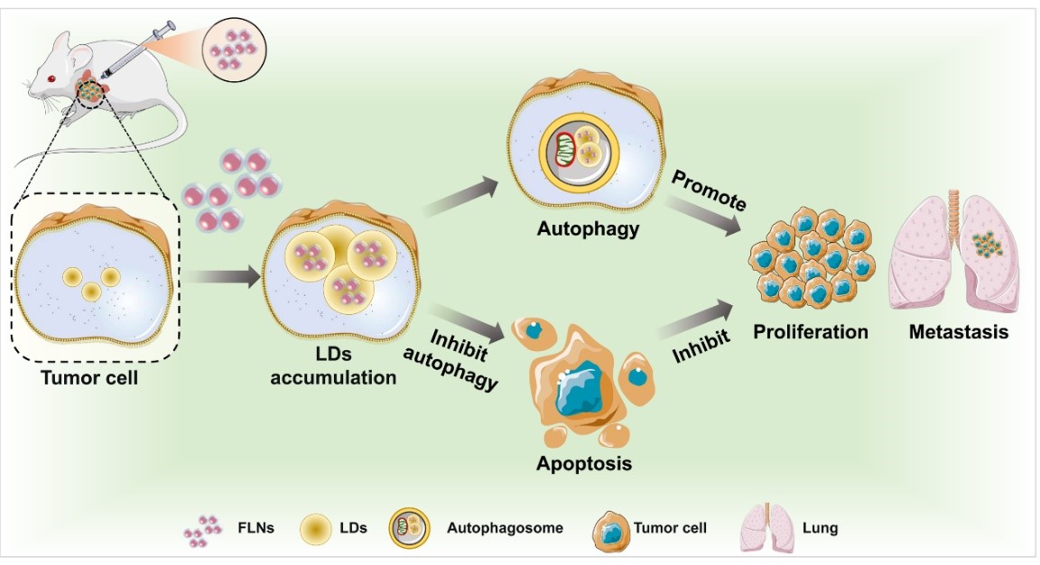 纳米颗粒作为生物医学载体具有结构、尺寸和表面化学的高度多样性,导致其与细胞/细胞器相互作用的复杂性。目前学界对食源性纳米颗粒引发的次级生物效应(包括潜在益处和风险)仍缺乏系统认知。本研究发现,食品脂质纳米颗粒(FLNs)被细胞摄取后,选择性地与脂滴而非溶酶体发生融合,促进脂滴积累,进而通过AMPK-mTOR-ULK1信号通路触发自噬。这一级联反应最终促进肿瘤细胞的生长和侵袭。值得注意的是,抑制自噬不仅能逆转FLNs介导的促肿瘤效应,还可诱导线粒体功能障碍、活性氧水平升高及脂滴过度累积,最终导致肿瘤细胞凋亡。这些协同作用有效抑制了肿瘤血管生成、增殖和转移潜能,同时保持正常细胞功能不受影响。动物实验进一步验证了这一发现。小鼠实验结果显示,瘤内注射FLNs并结合自噬抑制剂(3-MA),能够有效抑制肿瘤的血管生成、增殖和转移,同时不损害正常组织,证实了FLNs联合自噬抑制剂的抗癌策略的有效性与安全性。该研究为深入理解食源性大分子纳米颗粒在细胞内的生物学效应提供了重要依据,也为未来的肿瘤治疗研究开辟了新的方向。