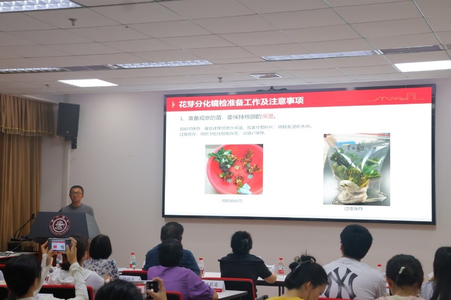 在实操环节,学员们分组进行镜检操作,连红莉及其团队成员巡回指导,耐心解答学员在显微镜使用、花芽判定等方面遇到的问题,确保了培训内容的落地与转化。